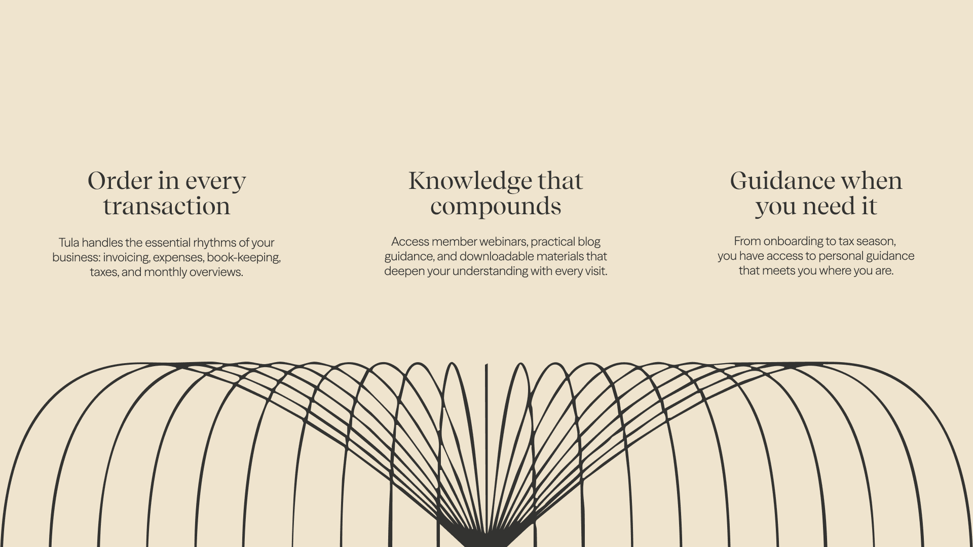 Tula is a financial management app for entrepreneurs, grounded in the concept of "ancient order". With a confident, calm voice that empowers rather than prescribes,